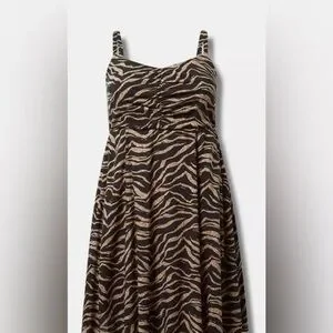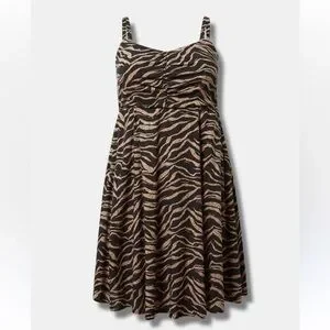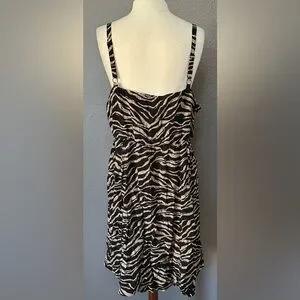 Eye-catching zebra print in brown and black. Spaghetti straps and a flattering A-line skirt. Soft, drapey fabric for easy movement. Chic for day or night outfits.