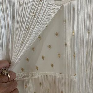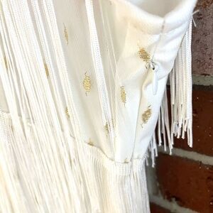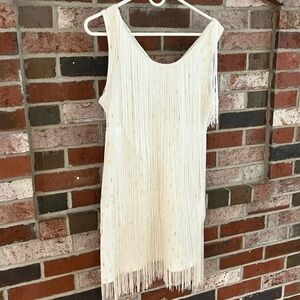 Sparkling silver fringe mini dress with a V-neck. Shimmering sequin and bead details add movement. Sleeveless design for easy wear. Perfect for parties and nights out.