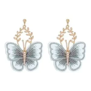 Gold-tone leafy drop earring with a light blue embroidered butterfly charm. Sparkling rhinestone body adds subtle shine. Lightweight and eye-catching for daytime or evening wear.