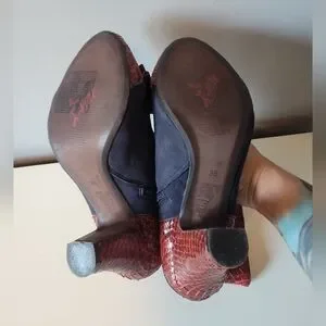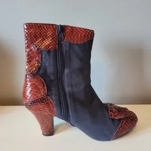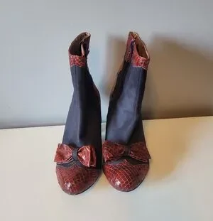 Ankle Boots in navy suede with red scalloped snakeskin accents at heels, toes, and bow. Zips at sides. Adorable style from vintage inspired brand Miss L Fire, which is sadly no longer in business! This brand was carried at Anthropologie, but I'm not sure about this style.