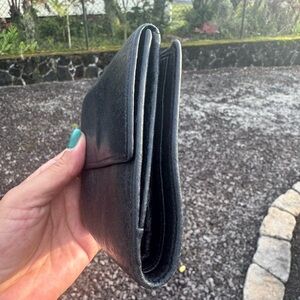 The wallet includes multiple card slots, ID window, bill compartment, and snap closure.
