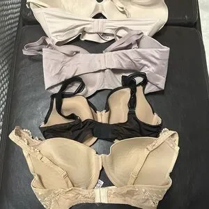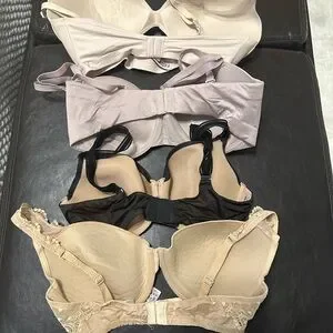 Elegant Victoria's Secret bras in cream, gray, black, and tan. Soft and supportive. Perfect for everyday comfort. 3 victoria’s Secret and 1 DKNY. They are all 34DD