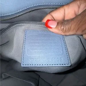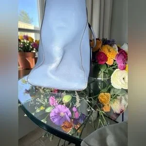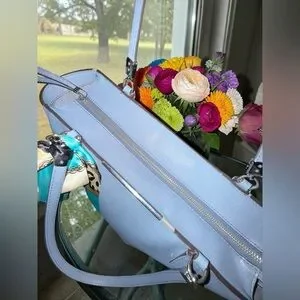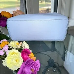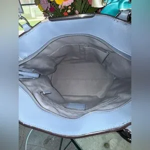 Beautiful Coach light blue tote crafted in durable saffiano leather with a structured silhouette. Features slim shoulder straps, a clean minimalist front with metal logo detail, and a spacious interior perfect for everyday use. Styled with a chic scarf and pom charm for a playful, elevated touch (both removable).