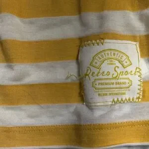 Yellow and white striped tee with Reebok Retro Sport patch. Lightweight, semi-sheer. Great for layering