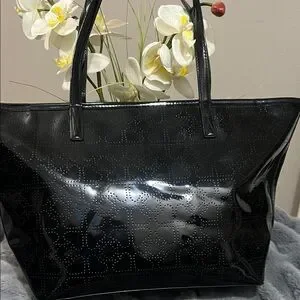 Kate Spade New York "Harmony Metro" Tote. It is characterized by its glossy PVC exterior featuring a signature perforated pattern of hearts and spades. Excellent used condition - no call outs.