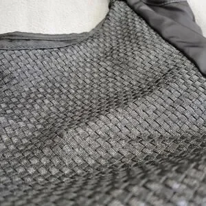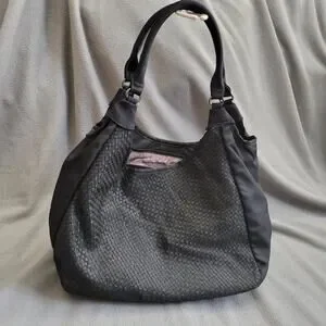 Very good condition Zeealexis boho-style handbag in black. Features a tactile woven front/back pattern, solid side panels, and a removable adjustable crossbody strap.