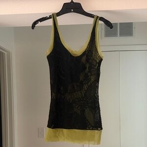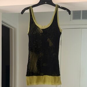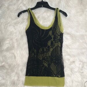 Exceptionally cool Jean Paul Gaultier tank top. Black design stretchy overlays a Green underlayer. One of a kind. Gently preloved condition with one blemish in the front as pictured, barely noticeable.