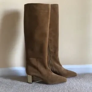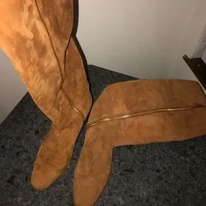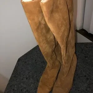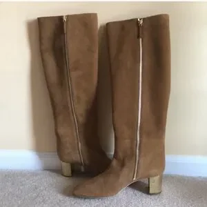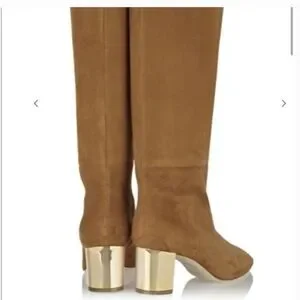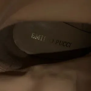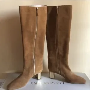 Gorgeous, stylish boots by Emilio Pucci. Fits right below the knee depending on your height. Soft suede material. Elegant tan color with trendy gold heel. Only wear noted is on bottom of boots otherwise they're in beautiful shape. They are priced @ $1,350 new.