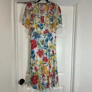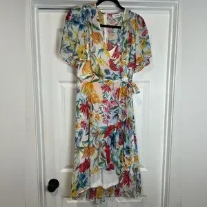Calvin Klein wrap dress in a white base with a colorful floral print. V-neckline and short flutter sleeves. Self-tie waist for an adjustable fit. High-low hem adds flow and movement. Lightweight, breezy fabric ideal for warm days.