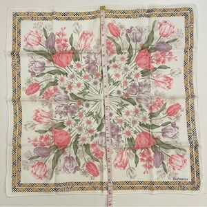 Elevate your accessory collection with this authentic vintage Burberrys of London handkerchief. Featuring a stunning, symmetrical botanical print of tulips and daisies in soft shades of rose, lilac, and cream, this piece perfectly blends English garden charm with iconic heritage style.