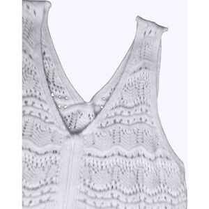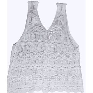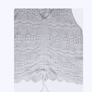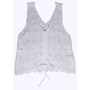 Eye-catching White (not cream or ecru - Pics do not show true color) crochet tank, a sleeveless top designed for warm-weather styling. The top features a V-neckline and a unique drawstring detail at the hem, allowing for adjustable fit and styling options. It showcases an intricate, see-through crochet design, lending a light and airy feel.