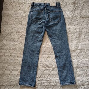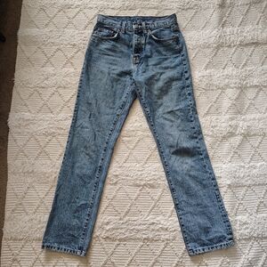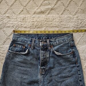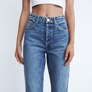 Stylish high rise vintage looking jeans. Classic blue denim. Perfect for casual wear. No stretch. Never worn. For short ladies like me they are regular length, for tall ladies they are ankle length.