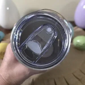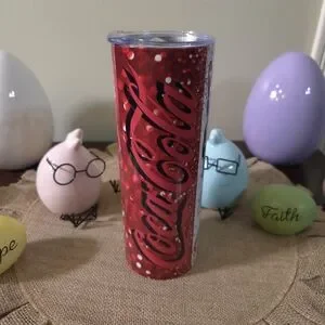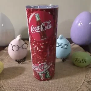 Coca Cola branded slim tumbler featuring a stylized woman with sunglasses and a red polka-dot headband. Bold Coca Cola script near the base. Clear lid for sip access. Playful retro pop-art design.