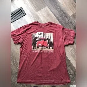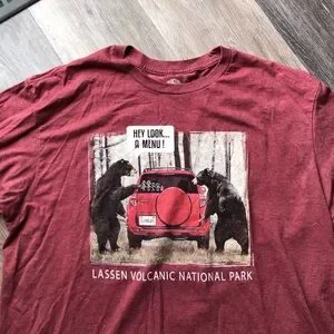 Red t-shirt featuring a Lassen Volcanic National Park graphic with bears and a car.