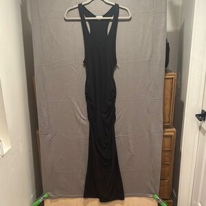 Sleek black maxi dress with a sleeveless Racerback cut. Ideal for any occasion. Rusching on sides.