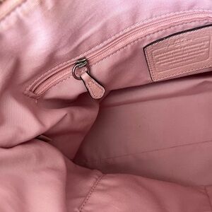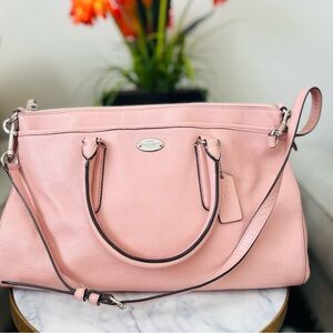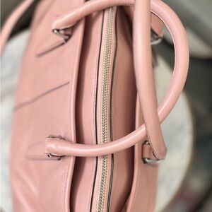 Elegant pink leather satchel designed for everyday use. Features a removable shoulder strap and double top handles for versatile carry. Polished hardware and a subtle logo tag add refined detail. Soft pink color complements a range of outfits.