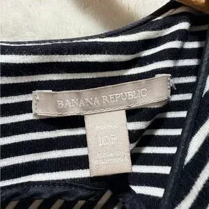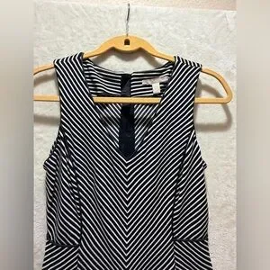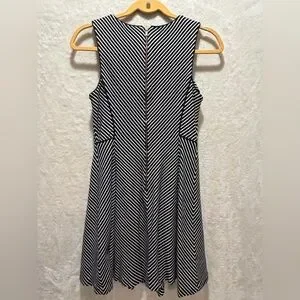 Timeless and ultra flattering Banana Republic black and white striped dress featuring a structured fit & flare silhouette with a chevron waist design that enhances shape beautifully. The mixed stripe pattern creates a slimming effect while adding modern, eye-catching style.