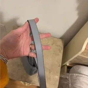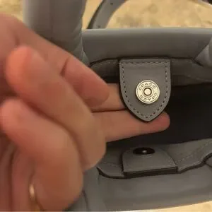 This solid grey-blue leather tote features a snap closure, double grey-blue leather handles, and silver hardware. Perfect for everyday use, this mini tote includes a detachable strap. With inner pockets, a lined interior, and an adjustable cross-body strap, this tote offers both functionality and elegance for the fashion-forward woman.