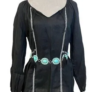 This Turquoise-tone western concho chain belt is the easiest way to pull an outfit together. Oval faux turquoise stones with beaded detailing add instant boho-cowgirl energy, while the medium-width links drape smoothly over dresses, tunics, or high-waisted denim. The adjustable chain tail and lobster clasp let you fine-tune the fit for comfy, all-day wear. Perfect for festivals, concerts, rodeos, vacations, and nights out. Condition: New with tags.