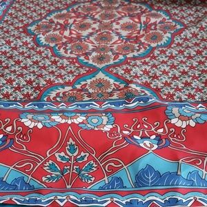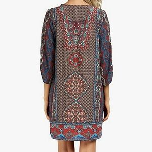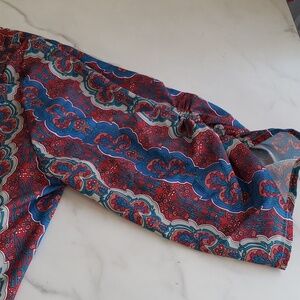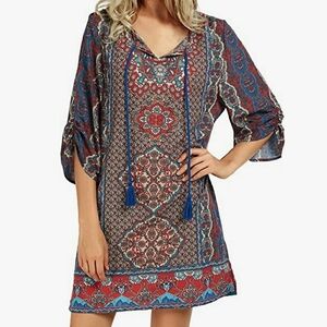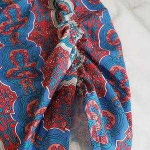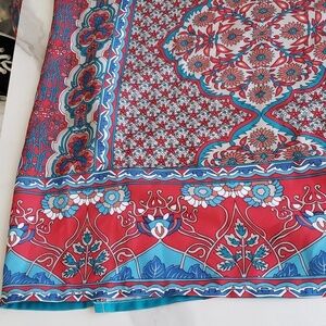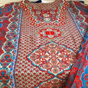 Urban Coco swimsuit cover-up. V-neck, with beautiful pattern and self-tie neck. Burgandy with a turquoise blue and olive green design, and a patterned hem. Vents on either side. Great as a dress or a cover-up at the pool club or the beach.