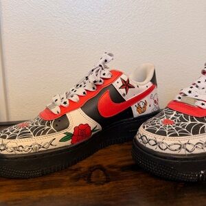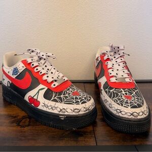 Nike Air Force 1 sneakers featuring bold red Swooshes. White leather panels with black spiderweb and tattoo-style graphics. Cherry motifs and star-patterned laces. Classic low-top streetwear design.