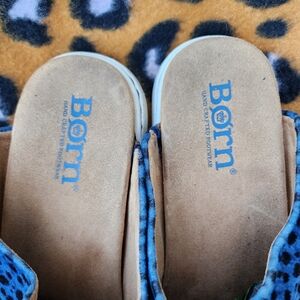 Born Zen blue cheetah print slide clogs size 11. Good used condition. Has walking wear on the bottoms. a bit of wrinking from storage. overall in good shape. faux suede upper material and footbed, slip on style.
