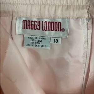 Sleek midi pencil skirt by Maggy London. Soft blush hue with a subtle sheen. Clean, tailored silhouette for polished looks. Pairs well with neutral or bold tops. Feminine,