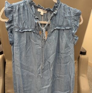 Blu Pepper Chambray Denim Blue Sleeveless Blouse With Ruffles, Small