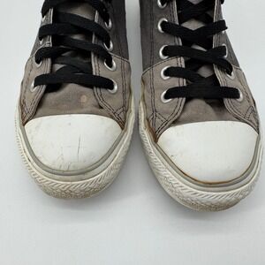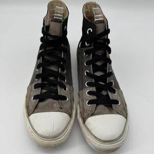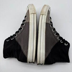 Chuck Taylor All Star high top sneakers feature a unique tri-panel colorblock design in shades of black and grey. These classic canvas shoes are built with a durable textile upper, signature rubber toe cap, and the iconic star ankle patch. The lace-up closure with silver-tone eyelets provides a secure fit, while the vulcanized rubber outsole ensures reliable traction. Minor scuffs and wear as shown in photos.