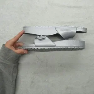 These Birkenstock Madrid EVA sandals offer a lightweight and flexible design for all day comfort. The metallic silver finish provides a sleek look while the adjustable buckle strap ensures a secure fit. These slides are perfect for casual wear or trips to the beach and pool.
