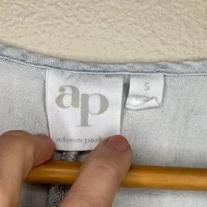 Lightweight chambray-style blouse from Anthropologie’s ap line. Soft lyocell-linen blend with a relaxed fit, tiered peplum hem, and short flutter sleeves. Split V neckline with subtle stitching details. Easy, breathable piece for spring and summer.