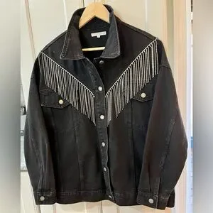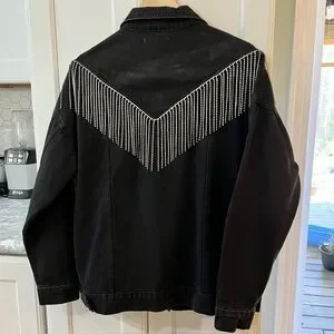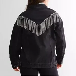 Warm & stylish denim jacket with shiny rhinestone fringe.
