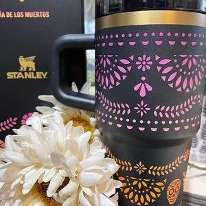 Rare limited-edition Stanley 20 oz Quencher celebrating Día de los Muertos. Features a sleek black matte finish with vibrant pink, orange, and gold floral and sugar skull designs. Comes in original decorative box — ideal for collectors or gifting!