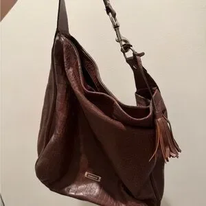 Croc-embossed leather hobo from Coach. Wide single shoulder strap with metal hardware. Leather tassel accent. Soft, slouchy silhouette. Classic everyday style.