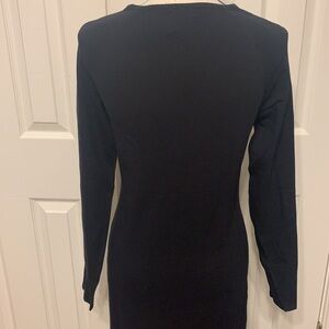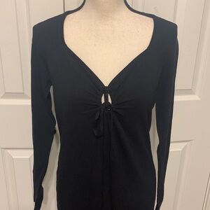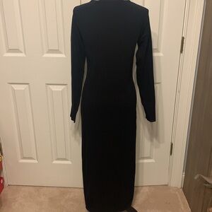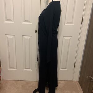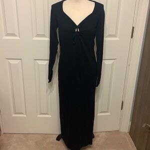 NWOT super soft knit maternity dress. Designed to go from bump to baby. Tie front with keyhole detail. Stretchy and NOT see through. Long sleeves. Side slit Size 10 Color Black Viscose/Polyamide 17” PTP & 49” L