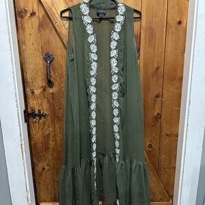 Elegant green sleeveless vest with lace trim. Ideal for layering.