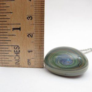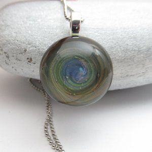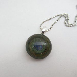 This listing is for the Boro glass pendant necklace pictured. It is a unique glass piece with a silvertone bail. It comes on a 28 inch tiny ball chain. The cab was made by a USA artist that I can't remember. The necklace was made by me. It is new and unworn.