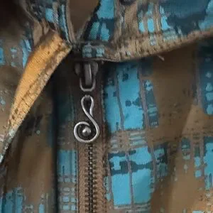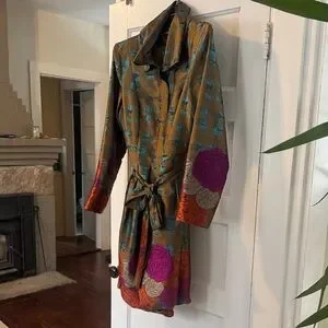 Silky olive green long-sleeve wrap dress coat by Samuel Dong. Bold purple and orange floral panels at hem and sleeves. Self-tie waist for shape. Notched collar and button-front styling. Vibrant contrast details elevate the piece. Like new condition. Worn once. Has been protected and hanging in closet since. Very small pull on sleeve (shown in photo). Paid full price at a boutique store years ago. Offers encouraged!