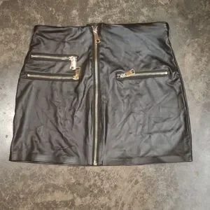 Sleek black faux leather mini skirt with bold gold zipper accents. Center front zipper and three decorative gold zippers add edgy, modern style. Smooth finish for an elevated look that pairs easily with tees or blouses.