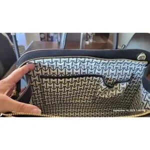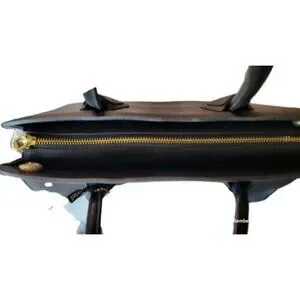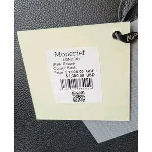 Moncrief London Robbie satchel bag crafted from premium black pebbled leather with elegant gold-tone hardware. This sophisticated piece features a structured silhouette with double top handles and a secure zip-top closure. The interior is lined with a signature geometric print fabric and includes multiple organizational compartments, such as a zippered pocket and slip pockets. Protective feet at the base ensure durability, while the minimalist gold foil branding on the front adds a touch of luxury. This item is in new condition with original tags attached.