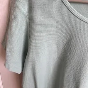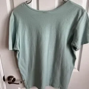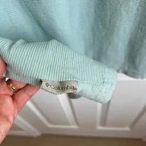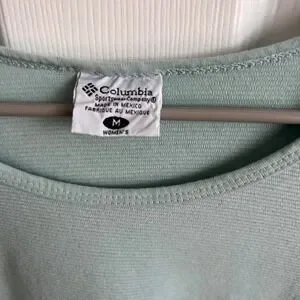 A classic and comfortable addition to any wardrobe: a Columbia Sportswear Company short-sleeve mint colored shirt. This top features a subtle ribbed texture that adds visual interest and a soft, breathable feel. The design includes a flattering scoop neckline and a relaxed fit, making it perfect for everyday wear. The shirt is finished with a small Columbia logo tag at the hem, a mark of quality and style. See all photos for wear and measurements, item is pre-owned. Smoke and pet free home.