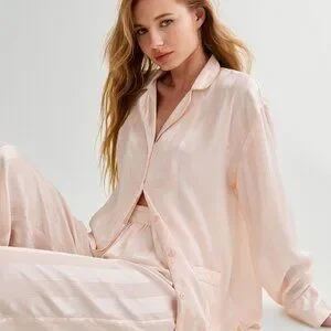 Nasty Gal Striped Jacquard Long Sleeves Pocket Detail Pajama Set in Champagne NWT