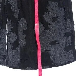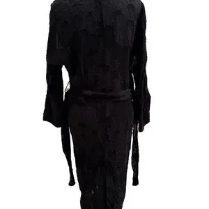 Stunning Wilfred Durante satin robe/duster from Aritzia in classic black. Features beautiful tonal textured leaf appliqué throughout with a sheer, lightweight satin feel.