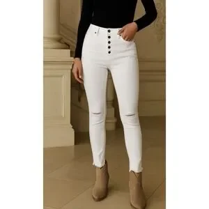 Look and feel great in these classic, button fly slightly distressed white denim ankle high rise skinny jeans with raw hem. Pair with boots or heels for going out, date night, festivals, the office, day-to-day, or wherever your adventures take you. So cute!