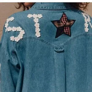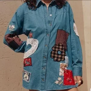 The Bombshell Patchwork Shirt in Chambray is the perfect blend of vintage charm and contemporary edge. With custom patches and a rich mid-tone rigid denim, this shirt exudes a sense of laid-back cool, while antique brass buttons add a touch of retro glamour. Unique patchwork design. Features floral and geometric patterns. Perfect for a stylish look.