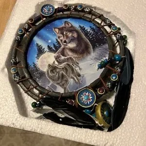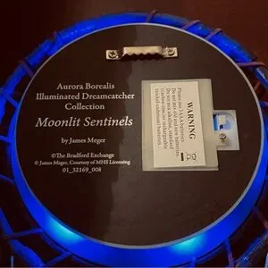 Enhance your home decor with this stunning wolf dreamcatcher. Featuring intricate blue and red accents, it adds a touch of nature and tranquility to any room. On-off switch. Uses 3 AAA batteries