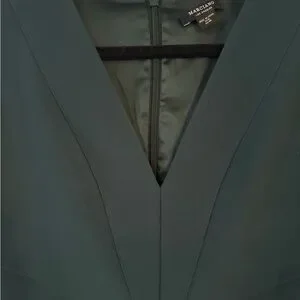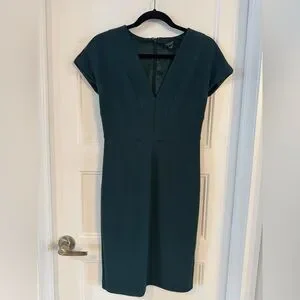 Structured sheath silhouette with a deep V-neck. Cap sleeves and princess seams create a tailored look. Sleek, minimalist design for work or events. Rich deep teal color adds refined elegance.