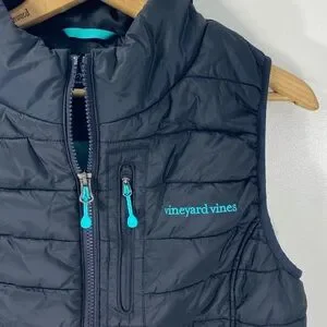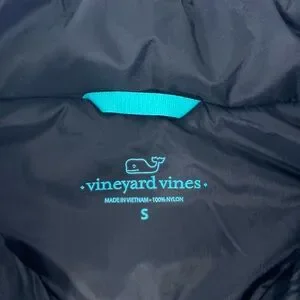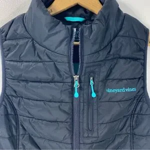 Preowned. Excellent condition. Vineyard Vines Quilted Mountain Weekend Puffer Vest. Women’s size S small. Dark navy blue exterior. Could pass for black in some lighting. Turquoise or aqua interior. Front zip closure. Side zip pockets. Left chest zip pocket. Logo front left chest and upper center back. Measurements and materials tag shown in pictures.