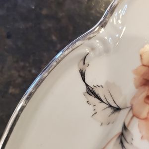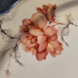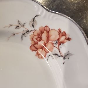 Vintage Edelstein Bavaria Maria-Theresia "Carmen" pattern (18013) 15" oval china serving platter. Pink flowers with grey leaves. Silver edging. 15" long, 10" wide. Some minor wear to the silver consistent with normal use. Otherwise excellent vintage condition. No chips, cracks, stains.