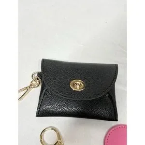 • Black Mini Coin Purse Keychain – Faux leather textured snap-turnlock flap with goldtone hardware.